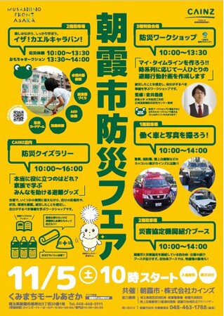 株式会社カインズ(代表取締役社長 CEO:高家 正行)は、カインズが運営するくみまちモールあさかで、防災について家族一緒に考え、理解を深めることができる体験型イベント「朝霞市防災フェア」を11月5日(土)に朝霞市と共催します。
