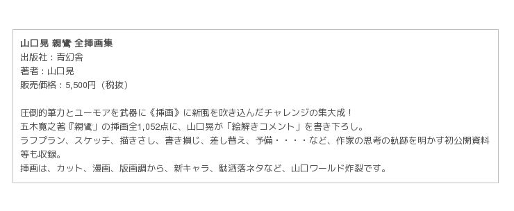 『親鸞全挿画集』は、五木寛之著『親鸞』の挿画全1052点すべてに書き下ろし「絵解きコメント」をつけ、初公開の下描き、描き損じ、差し替え図版とともに収録した作品集です。挿画は、カット、漫画、版画調から、新キャラ、駄洒落ネタなど、山口ワールド炸裂し、必見の内容となっています。