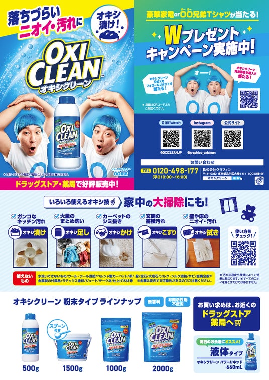 株式会社グラフィコ(代表取締役社長:マイケル・リード)は、酸素系漂白剤「オキシクリーン」のイメージキャラクターを務めるチョコレートプラネットさんによる新ビジュアルを本日2024年11月8日(金)より公開いたします。本ビジュアルは年末の大掃除シーズンに向けて、特設サイトや店頭など各所にて展開するほか、新CMとして12月13日(金)より全国のTV等で放映いたします。また、本日より『大掃除にはオキシクリーン!OO兄弟からのWキャンペーン』と題して、チョコレートプラネットさんの直筆サイン入り「OO兄弟」レプリカTシャツや豪華な家電が当たるプレゼントキャンペーンを実施いたします。