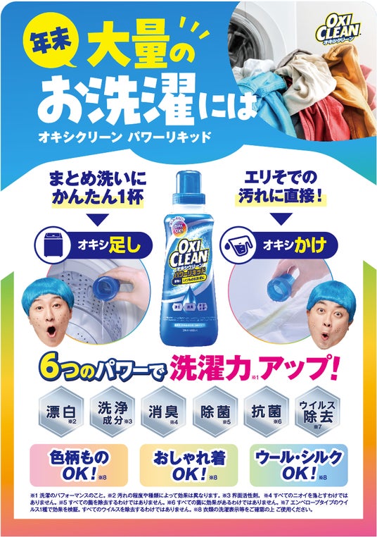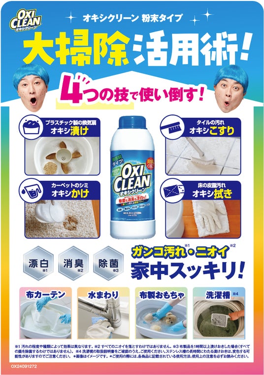 年末の大掃除に向けて、衣類の洗濯だけでなく、キッチン・浴室・リビングなど家中さまざまな掃除に使うことができる『オキシクリーン』。新ビジュアルは、イメージキャラクターのチョコレートプラネットさんを代表するネタである「TT兄弟」をオマージュした「OO兄弟」が登場します。オキシクリーン(OXICLEAN)の「O」がプリントされたTシャツと鮮やかなブルーのウィッグでオキシクリーンのイメージを体現し、家中で使えるオキシクリーンの様々なお掃除ワザを「OOポーズ」で見つけていきます。