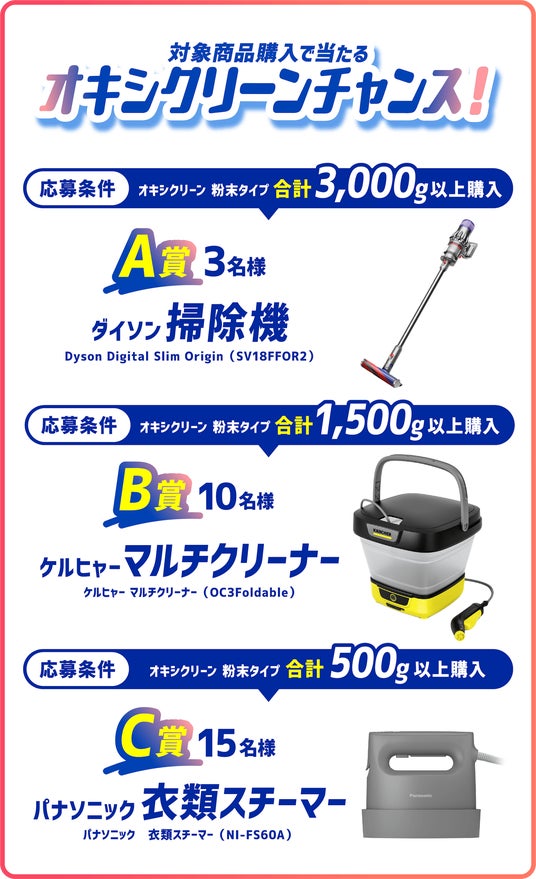 オキシクリーン粉末タイプ 500g/1000g/1500g/2000gの組み合わせによって、下記3つの賞へご応募いただけます。