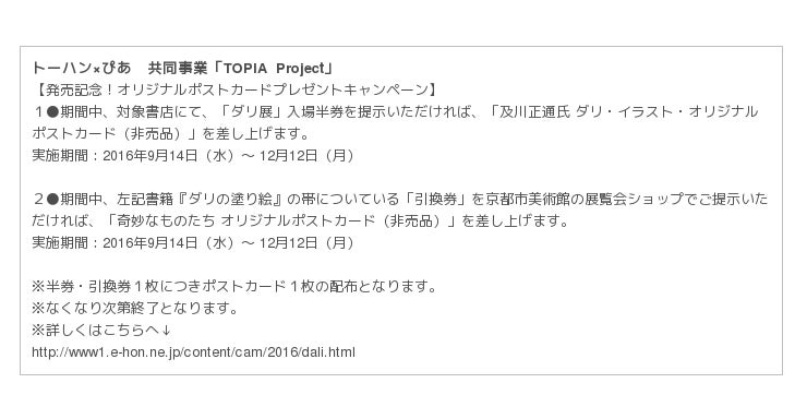 トーハン×ぴあ 共同事業「TOPIA Project」では、この発売を記念して「オリジナルポストカードプレゼントキャンペーン」」を実施。期間中、対象書店にて、「ダリ展」入場半券を提示いただくと、「及川正通氏 ダリ・イラスト・オリジナルポストカード(非売品)」をプレゼント。同じく期間中、『ダリの塗り絵』の帯についている「引換券」を国立新美術館ショップでご提示いただいた方には、「奇妙なものたち オリジナルポストカード(非売品)」を差し上げます。