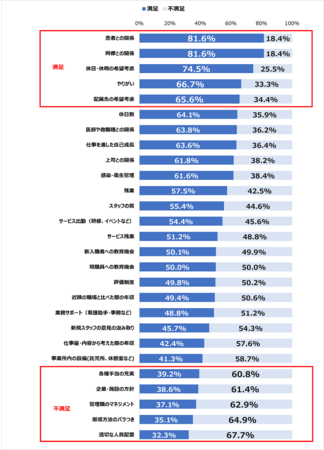 一方、不満を感じる点は「適切な人員配置(67.7%)」、「指導方法のバラつき(64.9%)」、「管理職のマネジメント(62.9%)」、「企業・施設の方針(61.4%)」、「各種手当の充実(60.8%)」となっており、看護師として働くことや人間関係への満足度は高いものの、組織のマネジメントや方針について不満を感じていることがうかがえる。