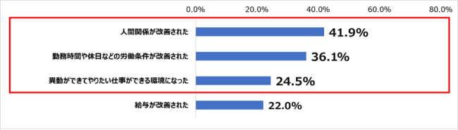 退職を取りやめるに至った退職理由の改善内容については「人間関係が改善された」が41.9%、「勤務時間や休日などの労働条件が改善された」が36.1%、「異動ができてやりたい仕事ができる環境になった」が24.5%だった。人間関係の改善は退職抑制の大きなポイントになると考えられる。