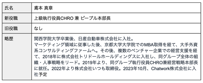 ビジネスチャット「Chatwork」(https://go.chatwork.com/ja/)やオンラインアシスタントサービス 「Chatwork アシスタント」(https://dx-center.chatwork.com/assistant/)等を提供するChatwork株式会社(本社:東京都港区、代表取締役CEO:山本正喜)は、以下のとおり役員人事を決議いたしましたのでお知らせします。
