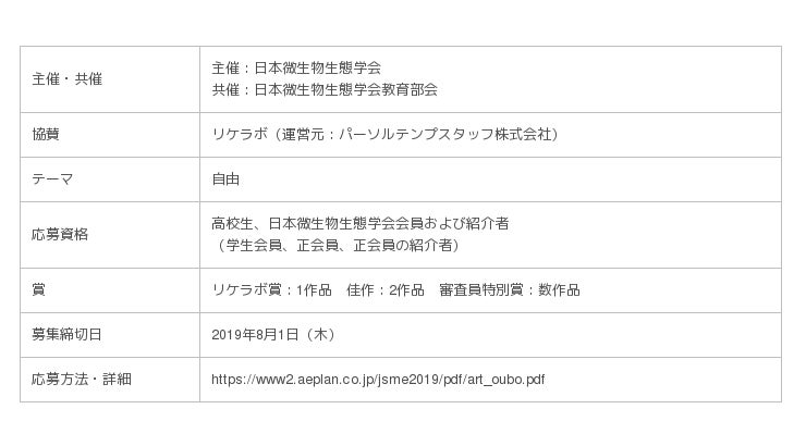 「微生物アートコンテスト」はアートを通じて微生物研究の楽しさを広く世の中に発信していくことを目的に、日本微生物生態学会が主催しています。学会員を中心に全国の高校生も応募可能で、審査には日本微生物生態学会所属の教授らが多数参加します。弊社は同コンテストにおいて、「リケラボ賞」を設け、受賞者に図書カード1万円分を進呈します。