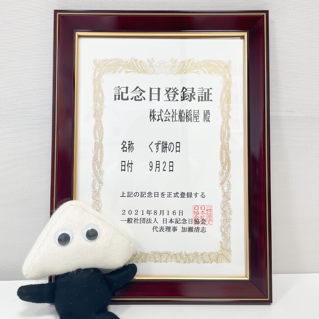 船橋屋公式SNSにて、フナバシスト(船橋屋ファンネーム)の皆さんとのコミュニケーションの中から生まれた記念日。くず餅の美味しさや伝統和菓子としての価値をもっと多くの人に知ってもらいたいという想いから、9月2日を「くず餅の日」として制定し、一般社団法人日本記念日協会からも認定を受けました。9月2日はくず餅のく(9)ず(2)と、くず餅のく(9)と船橋屋のふ(2)から由来しています。
