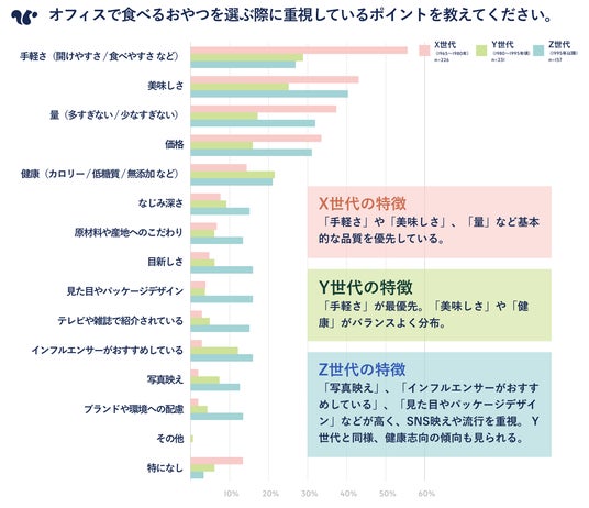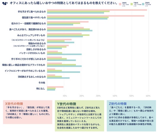 「個包装」(36.4%)や「手を汚さずに食べられる」(33.9%)も一定の支持がある一方、「環境に優しい商品」(20.4%)はX世代の3.5倍、「SNS映えするおしゃれなもの」(13.6%)も2.8倍と、環境意識やビジュアルへの感度の高さが際立ちます。