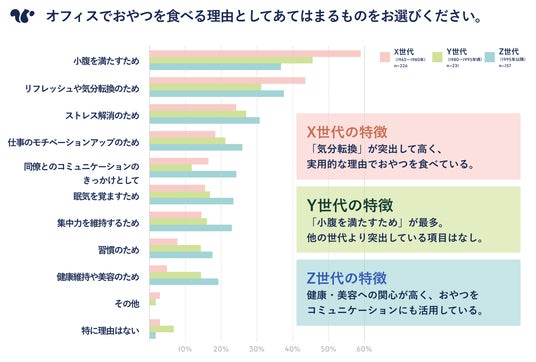 X世代と傾向は近く、「小腹を満たすため」(47.0%)が最多で、「リフレッシュや気分転換のため」(32.2%)が続きますが、「同僚とのコミュニケーションのきっかけとして」(12.2%)という人とのつながりに価値を見出す回答も見られました。