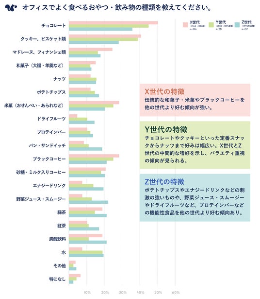 株式会社スナックミー(本社:東京都中央区 / 代表取締役:服部慎太郎)は、会社員614人を対象にオフィスでの間食に関する世代間調査を実施しました。本調査では、X世代(1965~1980年頃生まれ)、Y世代(1980年~1995年頃生まれ)、Z世代(1995年以降生まれ)の三世代を比較し、各世代の間食習慣や嗜好の違いを分析しました。世代ごとに異なるおやつ選びの傾向が明らかになり、特にZ世代は世代の違う同僚とのコミュニケーションのきっかけを求めていることがわかりました。