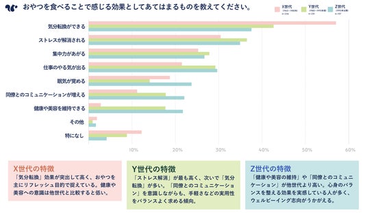 「気分転換ができる」(37.3%)、「ストレスが解消される」(34.7%)の他に、「健康や美容を維持できる」(21.2%)が挙がっており、これはX世代(2.9%)の約7.4倍に相当します。さらに「同僚とのコミュニケーションが増える」(22.0%)もX世代(11.6%)の約1.9倍と高く、Z世代は健康や人とのつながりといった、ウェルビーイングを意識したおやつ活用が特徴的です。