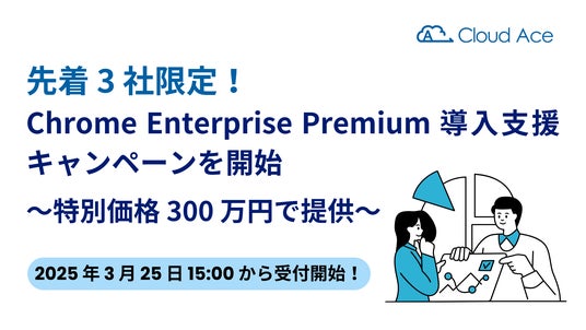 クラウドエース株式会社(本社:東京都千代田区、代表取締役社長:青木 誠、以下「クラウドエース」)は、2025 年 3 月 25 日(火)より、Chrome Enterprise Premium の導入支援パッケージを先着 3 社限定で通常 700 万円相当の内容を税込 300 万円(※)にて提供するキャンペーンを開始いたします。