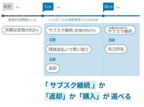 最初から所有する購入や返却前提のレンタルと違い、最低利用期間以降は「返却」または残価支払いによる「購入」が選べます。