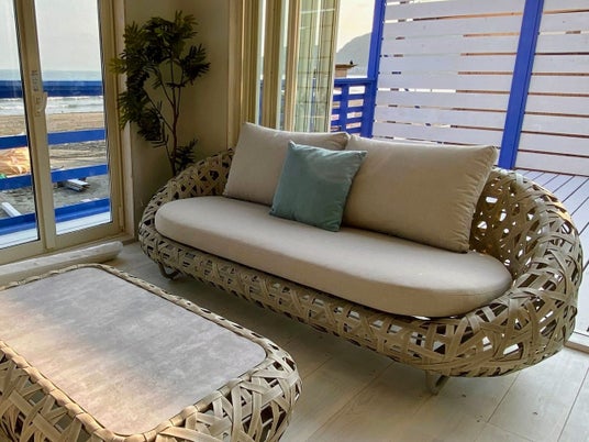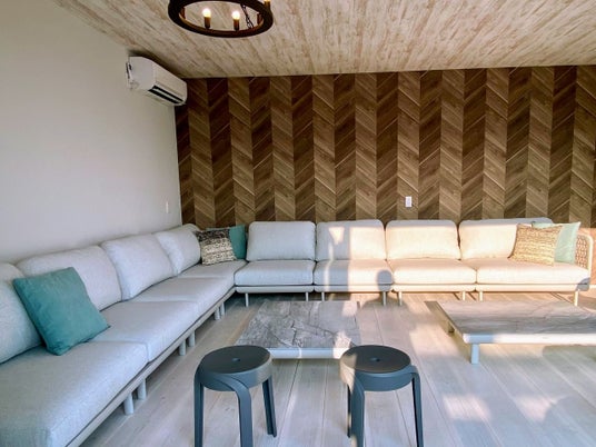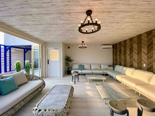 クラスの法人向け「CLAS Biz」は、循環型の家具・家電・什器を活用し、プロのデザイナーが理想の空間づくりを提案します。「avex beach paradise」では、高級海外リゾートをテーマに、印象的な大型L字ソファを中心に据え、ゆったりと贅沢な空間演出をしました。