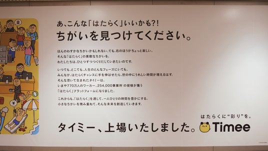 株式会社タイミー(所在地:東京都港区、代表取締役:小川 嶺)は、2024年7月26日(金)に、東京証券取引所グロース市場(証券コード:215A)に新規上場した(※)ことを記念して、渋谷駅に全長15メートルの「ちがい探し広告」を展開します。