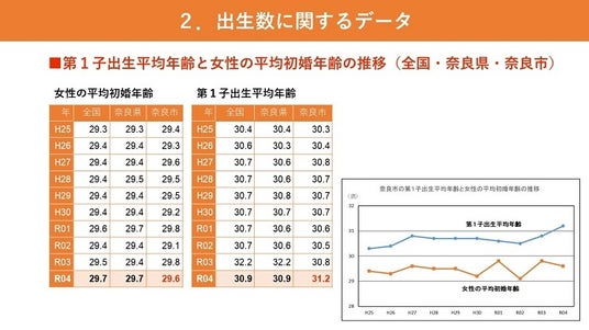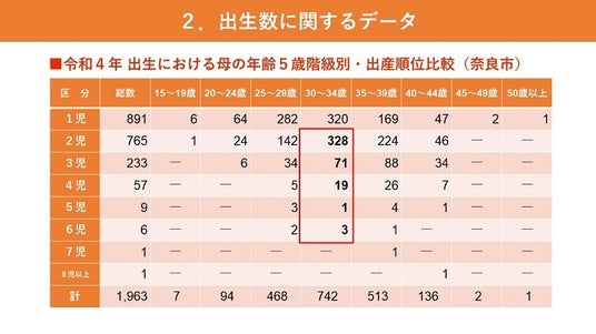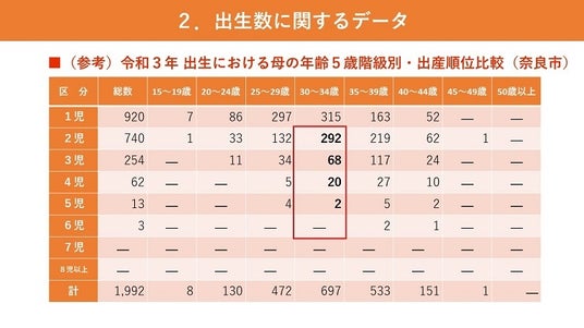 - 出生数減少の流れにあって、奈良市ではボリュームゾーンである30~34歳の出生数が増加しており、特に「第2子」以上の出生数が令和3年に比べて10%と増加傾向にあります。30~34歳の第2子以上の出生数増加が、令和4年の出生率を押し上げていると考えられます(5P)。【第1子】R3 315人 R4 320人(1%増)【第2子以上】R2 382人 R4 422人(前年比10%増)