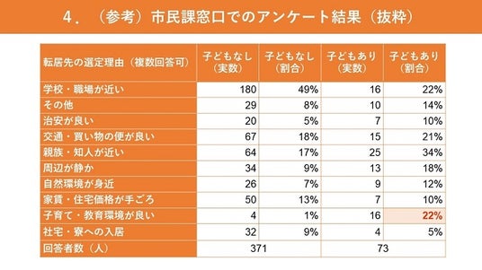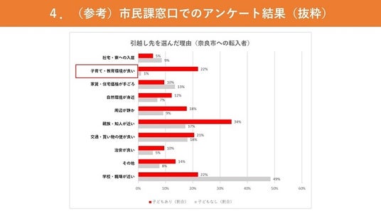 奈良市への転入者444人に「奈良市に引っ越した理由」を聞いたところ、「子どもあり」と「子どもなし」でその理由が異なることが分かった。特に、子どもがいる世帯については、「子育て・教育環境が良い」という理由が大幅に伸びており、「奈良市の子育て環境」が居住選択に影響を与えていることが見てとれる。