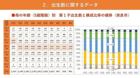 奈良市ではニーズを把握したうえで、「一般不妊治療等助成事業(上限額10万円)R5.1~)」「子ども医療費助成制度の高校生までの拡大(R5.4~)」「第2子目以降の利用者負担額(保育料)無償化(R5.4~)」「妊婦健康診査補助券の追加交付(R5.9~)」「すまいるmamaサポート(産後ケア事業)(R6.1月から利用料値下げ)」等の市独自支援を実施。また、市役所内の男性育休取得率の取り組み等を進め、啓発を行っています。