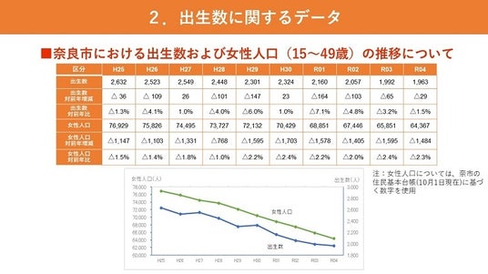 - 令和4年の合計特殊出生率は、全国及び奈良県で減少しており、全国は1.26(前年比0.04ポイント減)、奈良県は1.25(前年比0.05ポイント減)。奈良市だけでなく女性人口・出生数の減少は全国的な流れとなっています。