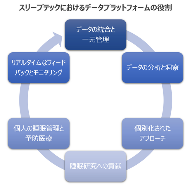 データプラットフォームは、睡眠データの統合と一元管理、データの分析と洞察、個別化されたアプローチ、リアルタイムなフィードバックとモニタリング、睡眠研究への貢献、個人の睡眠管理と予防医療の促進など、様々な側面で重要な役割を果たしています。データプラットフォームの存在は、睡眠テックの発展と成長に不可欠であり、個人の睡眠の質と健康を向上させるための革新的なアプローチを可能にしています。