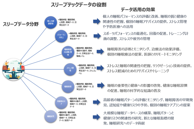 その中でも、個人の健康管理、パフォーマンス向上、睡眠障害の治療と管理、ストレス管理、睡眠教育、高齢者のケア、睡眠研究といった分野において、具体的なデータが収集され、分析されます。睡眠時間、睡眠周期、心拍数、環境データ、日常生活データ、睡眠中の動作などのデータが活用され、個人の睡眠パフォーマンスの評価や改善、睡眠障害の診断と治療、ストレス管理、睡眠教育、高齢者のケア、睡眠研究の推進などに役立てられます。それぞれの分野において特定のデータが重要となり、データを基にした対策やアドバイスが提供されます。このようなデータの収集と活用により、個人の睡眠の質と健康を向上させることが期待されています。