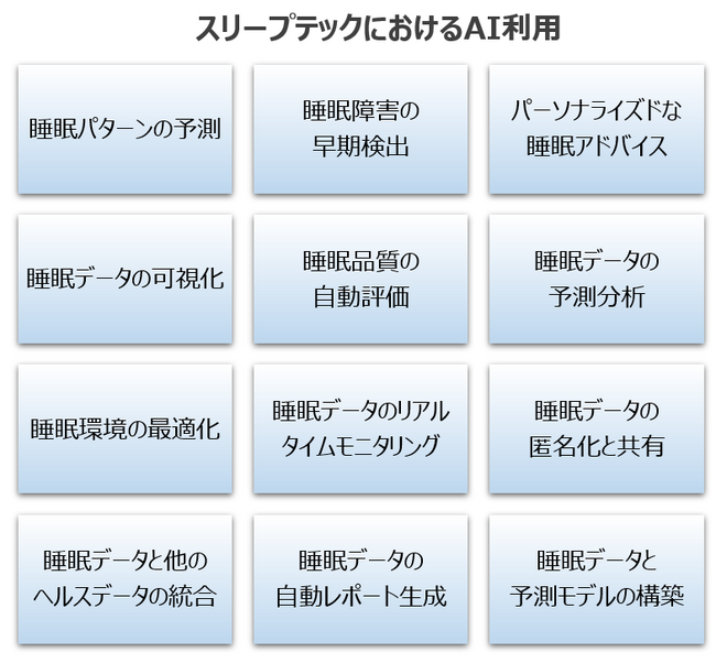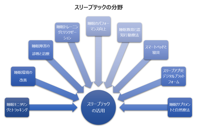 スリープテックは、睡眠に関連するさまざまな分野で活用され、睡眠モニタリングやトラッキング、睡眠環境の改善、睡眠障害の診断と治療、睡眠トレーニングとリラクゼーション、睡眠のパフォーマンス向上などの分野で活用されています。さらに、睡眠教育や認知行動療法、スマートベッドと寝具、スリープアプリとデジタルプラットフォーム、睡眠サプリメントと自然療法などもスリープテックの重要な分野です。こうしたスリープテックの進化と普及により、個人の睡眠状態の理解と改善が促進され、健康な睡眠習慣の確立に寄与しています。