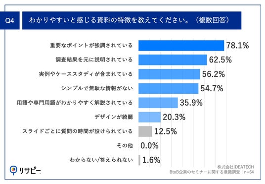 Q3で「資料がわかりやすい」と回答した方に、「Q4.わかりやすいと感じる資料の特徴を教えてください。(複数回答)」(n=64)と質問したところ、「重要なポイントが強調されている」が78.1%、「調査結果を元に説明されている」が62.5%、「実例やケーススタディが含まれている」が56.2%という回答となりました。
