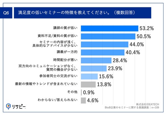 「Q6.満足度の低いセミナーの特徴を教えてください。(複数回答)」(n=109)と質問したところ、「講師の質が低い」が53.2%、「資料不足/資料の質が低い」が50.5%、「セミナーの内容が浅く、具体的なアドバイスが少ない」が44.0%という回答となりました。