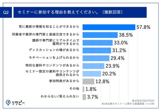 「Q2.セミナーに参加する理由を教えてください。(複数回答)」(n=109)と質問したところ、「常に最新の情報を知ることができるから」が57.8%、「同業者や業界の専門家と直接交流できるから」が38.5%、「講師や専門家にリアルタイムで質問ができるから」が33.0%という回答となりました。