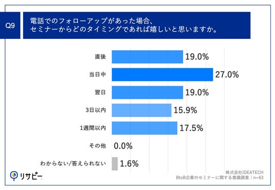 Q7で「非常にそう思う」「ややそう思う」と回答した方に、「Q9.電話でのフォローアップがあった場合、セミナーからどのタイミングであれば嬉しいと思いますか。」(n=63)と質問したところ、「当日中」が27.0%、「直後」が19.0%、「翌日」が19.0%という回答となりました。