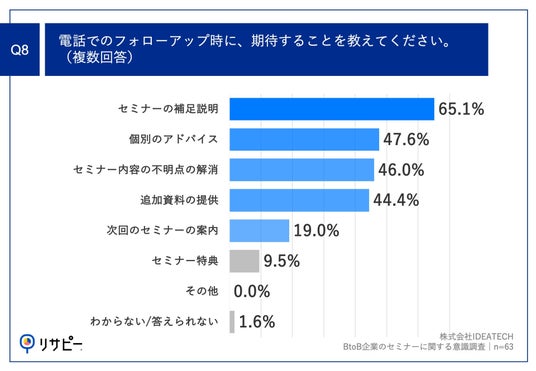 Q7で「非常にそう思う」「ややそう思う」と回答した方に、「Q8.電話でのフォローアップ時に、期待することを教えてください。(複数回答)」(n=63)と質問したところ、「セミナーの補足説明」が65.1%、「個別のアドバイス」が47.6%、「セミナー内容の不明点の解消」が46.0%という回答となりました。