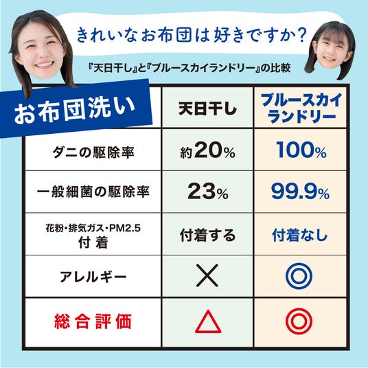 ◇ダニ駆除率は100%、一般細菌や大腸菌の減少率は99.9%と評価されており、中綿まで 徹底的にスチームで処理し、その日のうちに布団をクリーンに保つことができます。
