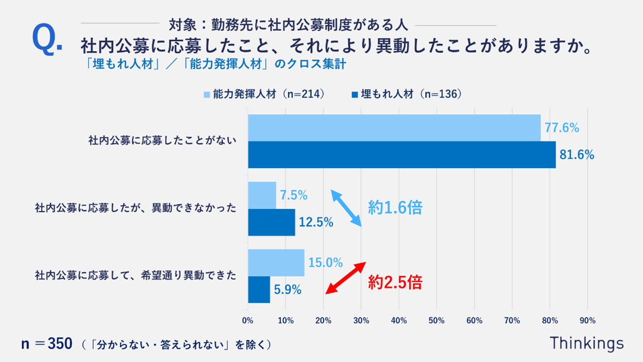 ・「社内公募に応募して、希望通り異動できた」人は、「能力発揮人材」15.0%、「埋もれ人材」5.9%と、「能力発揮人材」の方が9.1ポイント(約2.5倍)多いです。