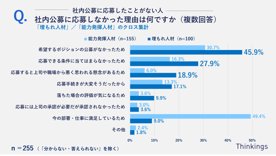 ・「埋もれ人材」はそれ以外のほとんどの項目で多く、最も回答が多いのは「希望するポジションの公募がなかったため」の45.9%。2番目は「応募できる条件に当てはまらなかったため」の27.9%。3番目は「社内公募に応募すると上司や職場から悪く思われる懸念があるため」の18.9%です。