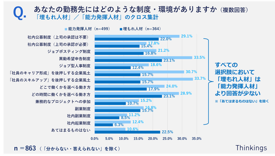 ⇒勤務先のキャリアや働き方に関する制度や環境が整っていないことが、「埋もれ人材」を生み出し、減らせない要因の1つになっていると考えられます。