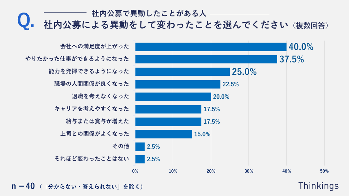 ・具体的な回答で最も多いのは「会社への満足度が上がった」40.0%、2番目は「やりたかった仕事ができるようになった」37.5%、3番目は「能力を発揮できるようになった」25.0%です。