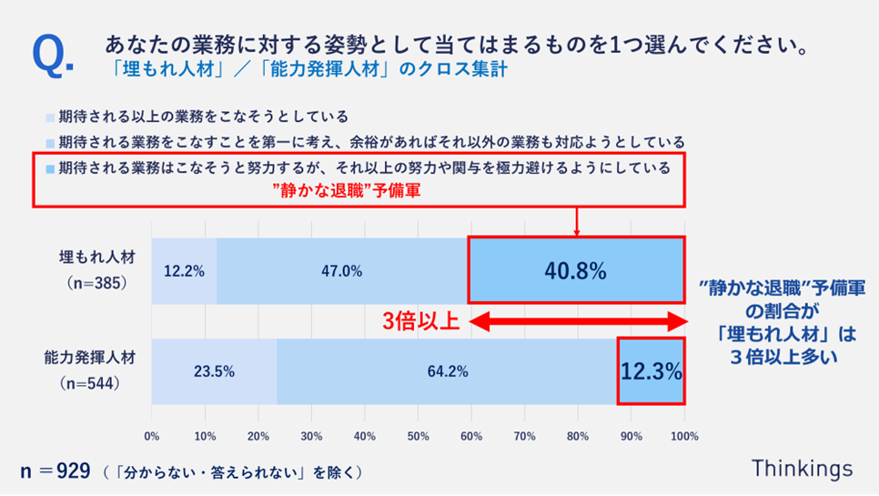 ・「期待される業務はこなそうと努力するが、それ以上の努力や関与を極力さけるようにしている」(“静かな退職”予備軍)は、「能力発揮人材」で12.3%、「埋もれ人材」で40.8%です。つまり、“静かな退職”予備軍の割合が、「埋もれ人材」は「能力発揮人材」の3倍以上になります。