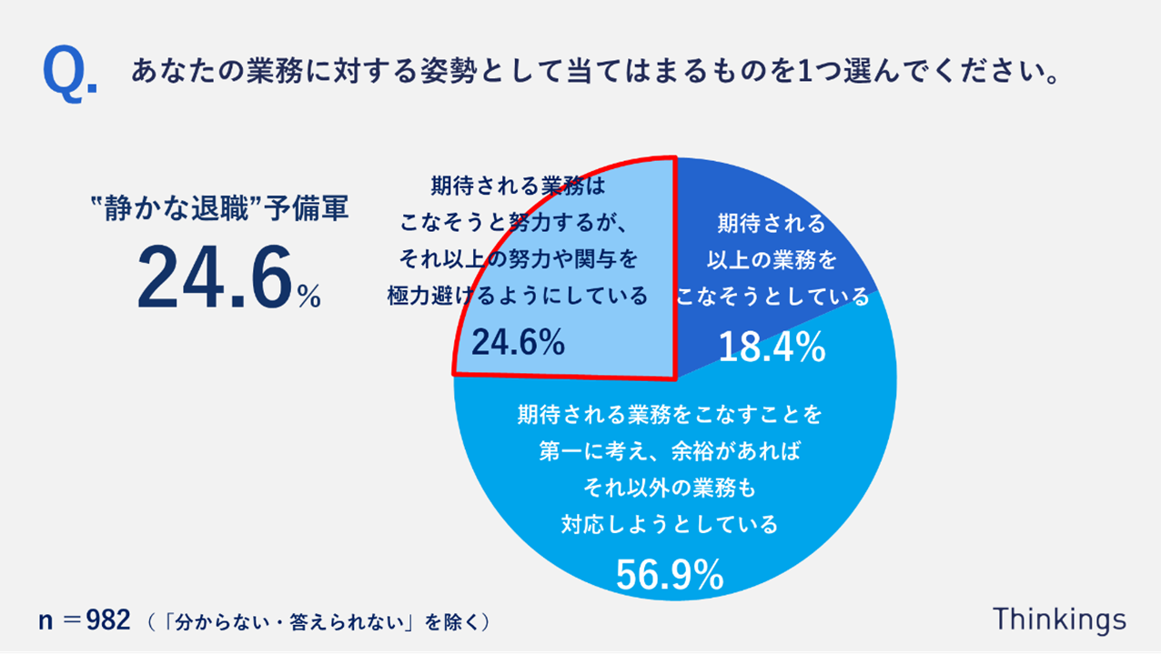 ・「期待される業務はこなそうと努力するが、それ以上の努力や関与を極力避けるようにしている」の24.6%を“静かな退職”予備群と位置付けます。“静かな退職”予備軍は全体の約1/4にあたります。