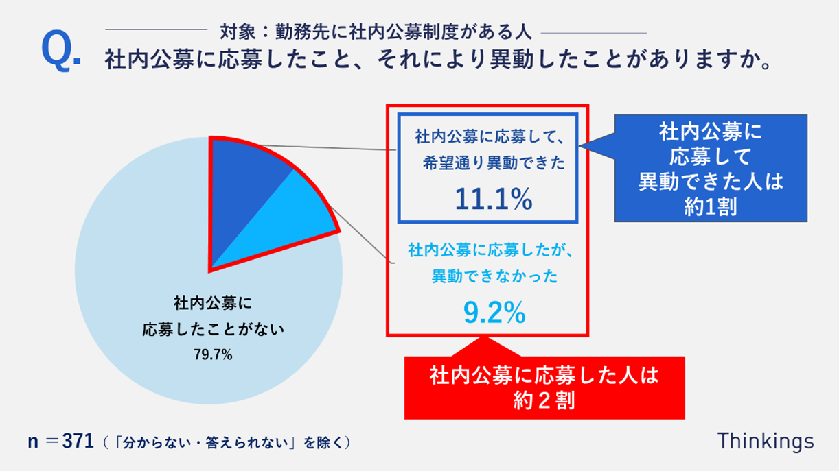 ・「社内公募に応募して、希望通り異動できた」人は11.1%、「社内公募に応募したが、異動できなかった」人は9.2%。つまり、社内公募に応募したことがある人は全体の約2割で、それにより異動できた人は全体の約1割です。