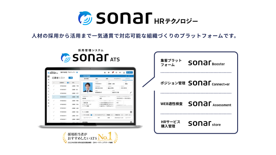 「sonar HRテクノロジー」は、人材の採用から活躍まで一気通貫で対応可能な組織づくりのプラットフォームです。その中心となる採用管理システム「sonar ATS」は、採用業務のデジタル化を通じて、各種オペレーションの自動化や、データ分析による効率化を実現。採用担当者の業務負荷を大幅に削減します。2012年よりサービス提供を開始し、株式会社NTTデータグループ、全日本空輸株式会社、ダイキン工業株式会社、トヨタ自動車株式会社、法務省、文部科学省、LINEヤフー株式会社など、累計2,300社を超える企業や官公庁に利用されています。