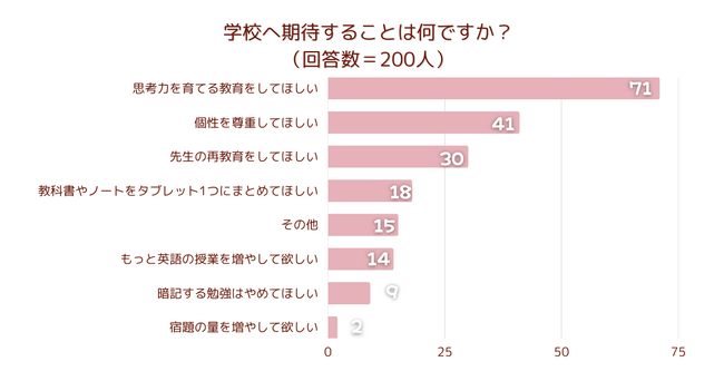 「学校へ期待することは?」とアンケート調査した結果、1位は『思考力を育てる教育をしてほしい』でした。