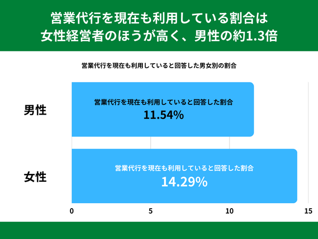 営業代行を現在も利用していると回答した割合を男女別でみてみますと、女性が14.29%、男性が11.54%という結果になりました。