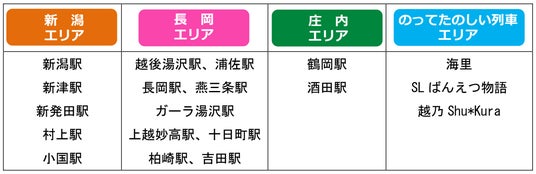 越後湯沢駅、浦佐駅、長岡駅、燕三条駅、新潟駅、ガーラ湯沢駅※、上越妙高駅、十日町駅、柏崎駅、吉田駅、新津駅、新発田駅、村上駅、小国駅、鶴岡駅、酒田駅 ※ガーラ湯沢駅は新幹線運行時のみ