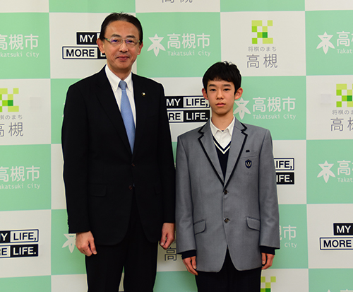 大阪府高槻市立阿武山中学校3年の名倉一裕さんが令和6年1月25日(木曜日)、高槻市役所を訪問し、第44回全国中学校スケート大会にフィギュアスケート部門で出場することを濱田剛史市長に報告しました。