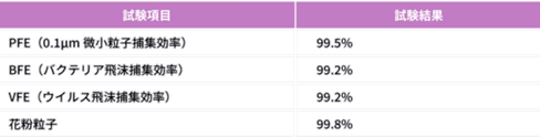微小粒子、バクテリア飛沫、ウイルス飛沫、花粉の捕集効率に関する結果