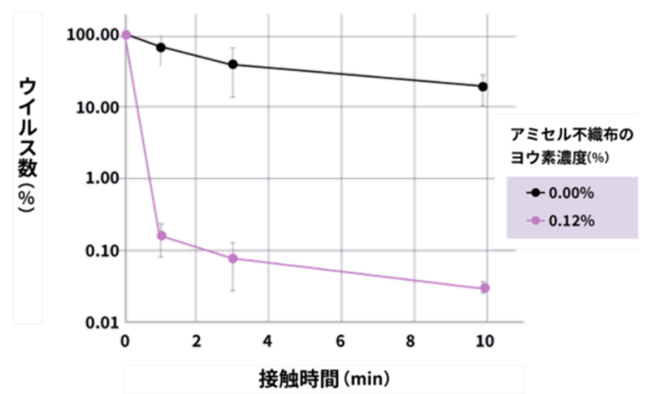 ヨウ素包接アミセル不織布にウイルスを含んだ液体を滴下し、一定時間後の生きているウイルス数を調査