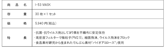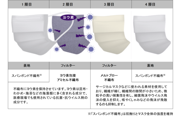 「I-53 MASK」は、元素記号が「I」、原子番号が「53」の「ヨウ素」を商品名に冠し、医療現場でも抗菌・抗ウイルスとして使われ「ヨウ素」を不織布に保持させた機能性マスクです。マスクは4層から構成され、それぞれが異なる機能を持っています。
