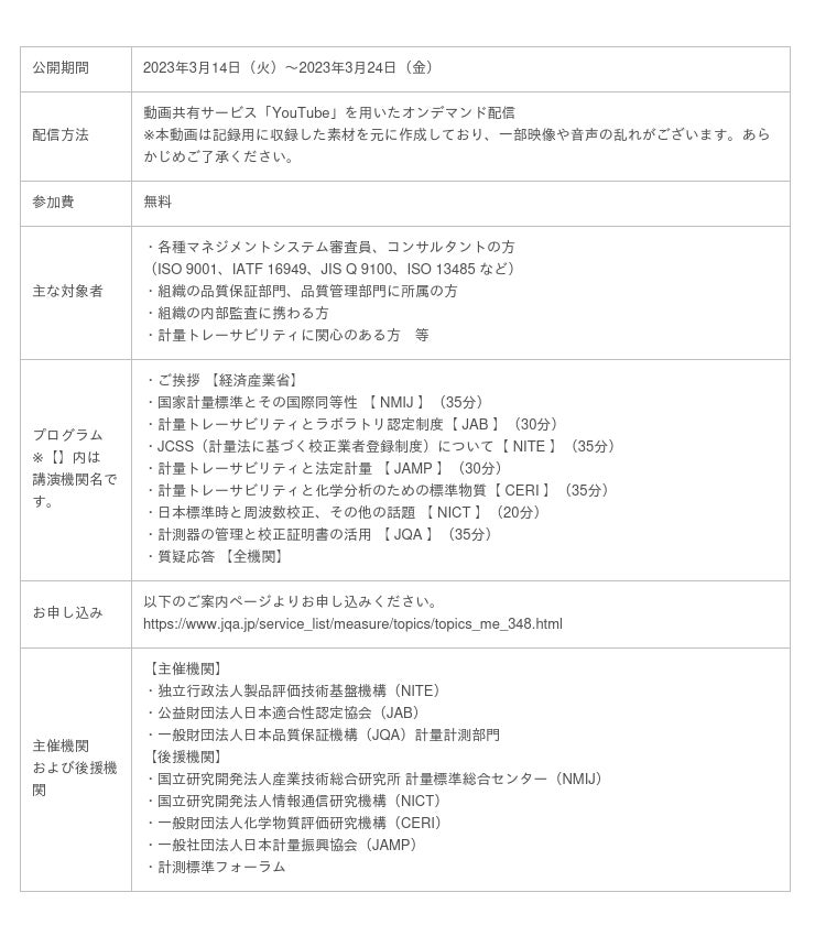 一般財団法人日本品質保証機構(本部:東京都千代田区、理事長:小林 憲明)計量計測部門は、独立行政法人 製品評価技術基盤機構(NITE)、公益財団法人日本適合性認定協会(JAB)との共催により2023年2月28日(火)に開催した「2022年度マネジメントシステムのための計量トレーサビリティ講演会」の模様を大変好評につき、オンデマンド配信いたします。