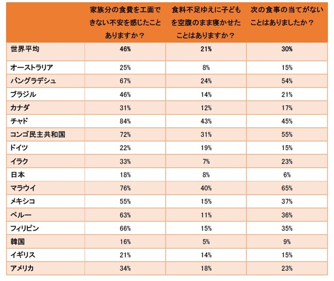 保護者の約10人に4人(37%)が「子どもが日常的に必要な栄養素を適切に摂取できていない」と回答し、10人に2人(21%)が過去30日間で「子どもが空腹のまま寝たことがある」と回答しました。さらに、世界の成人の約半数(46%)が、過去30日間で「食費不足の不安を感じたことがある」と回答し、低所得国では77%にものぼりました。過去30日間で次の食事の当てがないことがあったと答えた人の割合は30%でした。