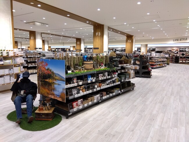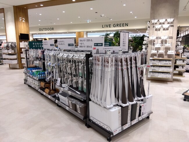 店内入口は、観葉植物や多肉植物、ガーデン雑貨が並ぶグリーンコーナーで構成され、お部屋の癒し空間を提案。また、奥へと進んでいくと、「外で食べる」シーンを想定した家庭用品×アウトドアや、レジャー×キッチンの商品が並び、お庭や外出先などの「お外で作って食べる」スタイルを提案しています。